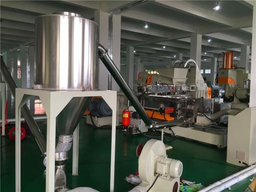 不銹鋼材質(zhì);3) 加熱區(qū)段:采用優(yōu)質(zhì)鑄鋁加熱器6、水冷卻系統(tǒng)1)水泵泵電機功率:3kw;自動控水電磁閥;手動閥用銅閘閥控制;加大水流量,2)采用環(huán)保風冷卻系統(tǒng)(環(huán)保型:發(fā)明專利號:CN201911312134.6)不需要接外循環(huán)水冷卻7、液壓板式換網(wǎng):通水冷卻系統(tǒng)1)換網(wǎng)器,板式過濾自動換網(wǎng)器,流量截面為圓形;低煙無鹵造粒機_省電20%_佳德塑機2)液壓缸、液壓站等一套,采用YA-N46抗磨46#液壓油;(油品需客戶自行采購)8、機頭裝置:1) 熱電偶與壓力傳感器分開安裝,分別用于檢測溫度和壓力(七)風冷模面熱切輔機系統(tǒng)1)風冷模面熱切造粒機:4級電機,功率1.5 kw;熱切刀一套、電機聯(lián)軸器一件,采用4把刀片切粒調(diào)速控制:采用“三晶或羅賓漢”變頻調(diào)速器2)切粒罩:對吹式,不銹鋼材質(zhì);一件;床身與切粒罩為整體式;推拉式結(jié)構(gòu);帶剎車裝置;熱切罩與機頭分離開有足夠空間;操作方便3)一級旋風分離器:φ600mm,不銹鋼材質(zhì);一件;采用φ130mm不銹鋼管聯(lián)接;連接方式:5.5kw物料輸送風機;4)二級旋風分離器:φ600mm,不銹鋼材質(zhì);一件;采用φ130mm不銹鋼管聯(lián)接,4kw物料輸送風機;5)加長振動篩:一臺,L=2.5m,電機采用:震動專用電機;震動量可以調(diào)節(jié)大小:電機功率率:0.15KW兩臺;振動篩篩網(wǎng)采用三層分離物料;大孔直徑φ8mm,小孔直徑φ2.5mm,不銹鋼材質(zhì),6)三級旋風分離器:φ600mm,不銹鋼材質(zhì);一件;采用φ130mm不銹鋼管聯(lián)接;連接方式:5.5kw物料輸送風機;低煙無鹵造粒機_省電20%_佳德塑機7)風吹成品料倉:一套,1m料倉一件,不銹鋼材質(zhì);采用φ130mm不銹鋼管聯(lián)接;4kw物料輸送風機;